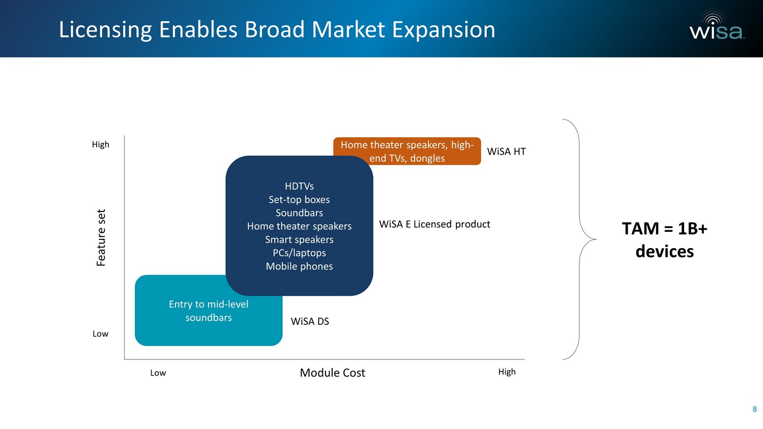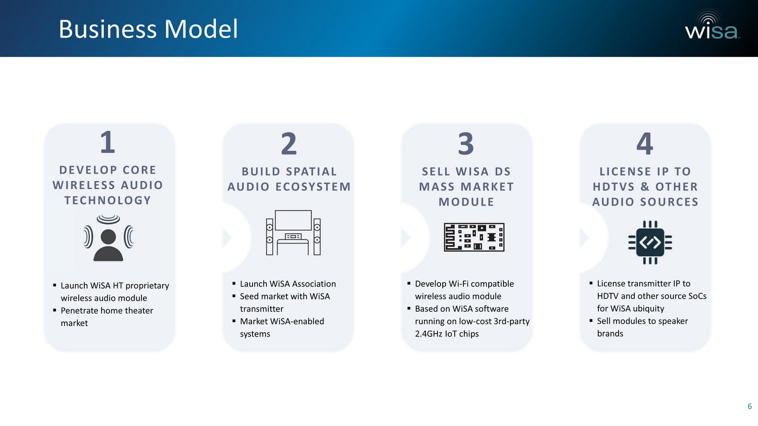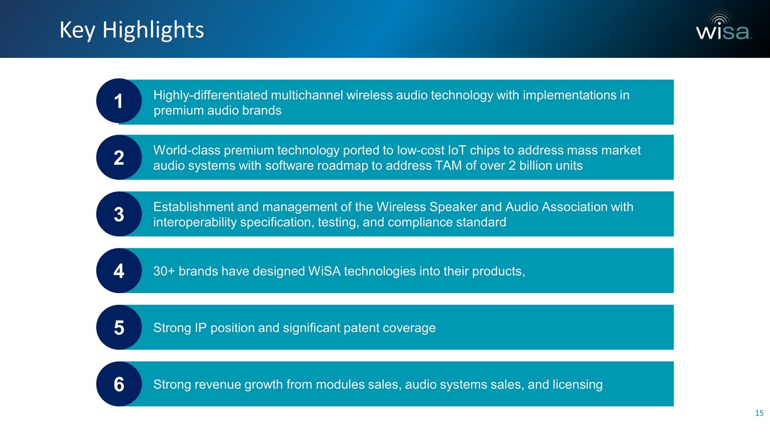 Key Highlights Highly - differentiated multichannel wireless audio technology with implementations in premium audio brands 1 World - class premium technology porte d to low - cost IoT chips to address mass market audio systems with software roadmap to address TAM of over 2 billion units 2 Establishment and management of the Wireless Speaker and Audio Association with interoperability specification, testing, and compliance standard 3 30+ brands have designed WiSA technologies into their products, 4 Strong IP position and significant patent coverage 5 Strong revenue growth from modules sales, audio systems sales, and licensing 6 15