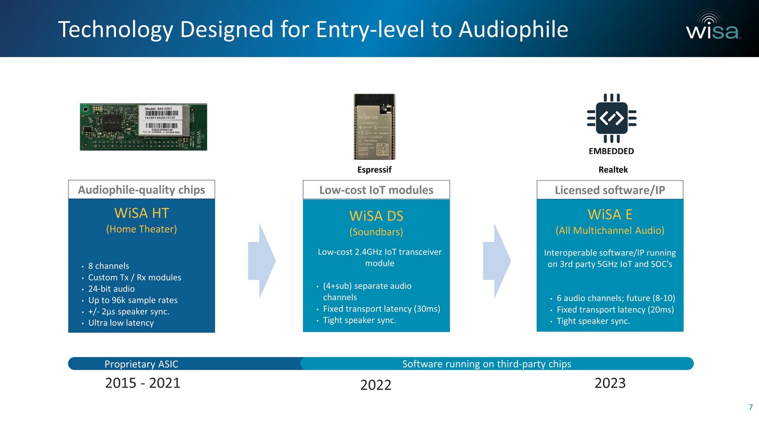 Technology Designed for Entry - level to Audiophile 2015 - 2021 2022 2023 WiSA DS ( Soundbars ) Low - cost 2.4GHz IoT transceiver module • (4+sub) separate audio channels • Fixed transport latency (30ms) • Tight speaker sync. WiSA HT (Home Theater) • 8 channels • Custom Tx / Rx modules • 24 - bit audio • Up to 96k sample rates • +/ - 2µs speaker sync. • Ultra low latency WiSA E ( All Multichannel Audio ) Interoperable software/IP running on 3rd party 5GHz IoT and SOC's • 6 audio channels; future (8 - 10) • Fixed transport latency (20ms) • Tight speaker sync. Proprietary ASIC Software running on third - party chips Audiophile - quality chips Low - cost IoT modules Licensed software/IP Espressif Realtek 7