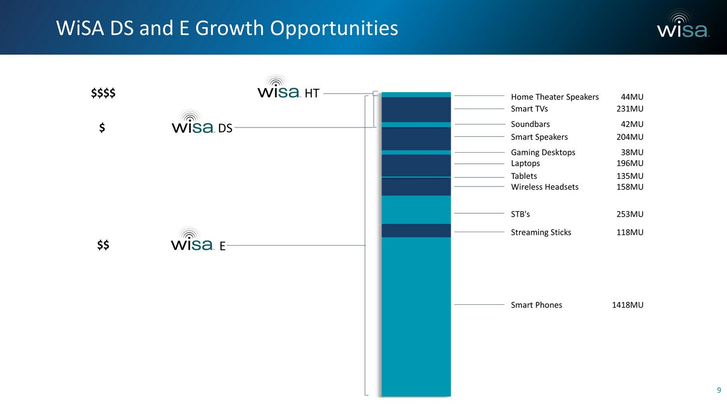 WiSA DS and E Growth Opportunities Home Theater Speakers 44MU Smart TVs 231MU Soundbars 42MU Smart Speakers 204MU Gaming Desktops 38MU Laptops 196MU Tablets 135MU Wireless Headsets 158MU STB's 253MU Streaming Sticks 118MU Smart Phones 1418MU HT DS E $$$$ $ $$ 9