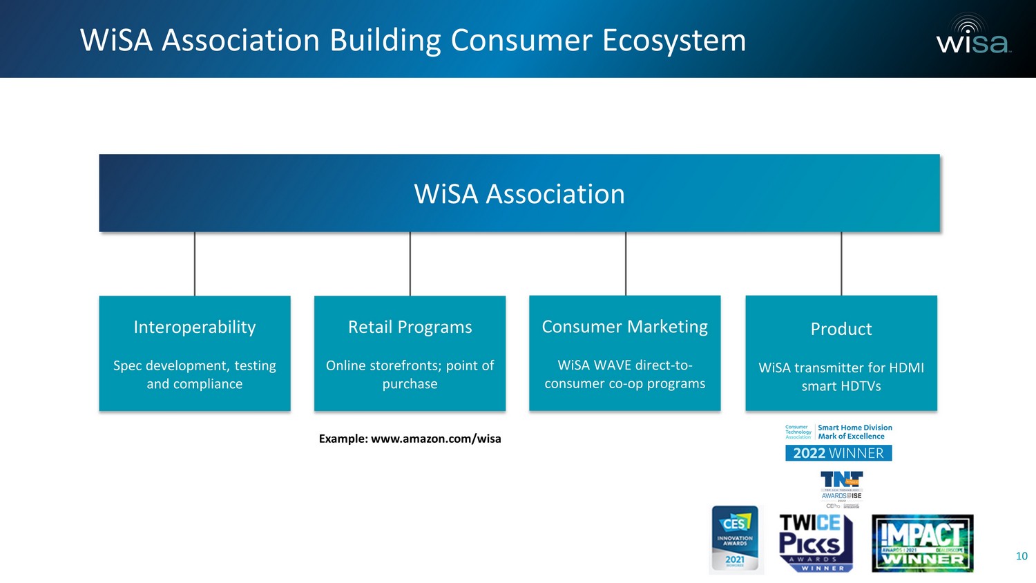 WiSA Association Building Consumer Ecosystem Interoperability Spec development , testing and compliance Retail Programs Online storefronts; point of purchase Consumer Marketing WiSA WAVE direct - to - consumer co - op programs Product WiSA transmitter for HDMI smart HDTVs WiSA Association Example: www.amazon.com/wisa 10