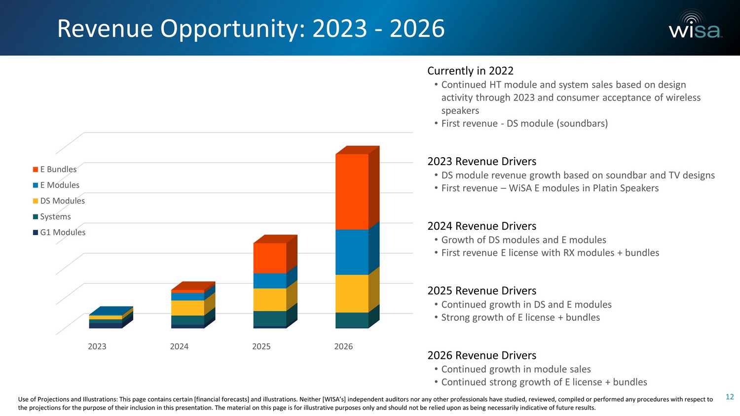 Revenue Opportunity: 2023 - 2026 Currently in 2022 • Continued HT module and system sales based on design activity through 2023 and consumer acceptance of wireless speakers • First revenue - DS module (soundbars) 2023 Revenue Drivers • DS module revenue growth based on soundbar and TV designs • First revenue – WiSA E modules in Platin Speakers 2024 Revenue Drivers • Growth of DS modules and E modules • First revenue E license with RX modules + bundles 2025 Revenue Drivers • Continued growth in DS and E modules • Strong growth of E license + bundles 2026 Revenue Drivers • Continued growth in module sales • Continued strong growth of E license + bundles 12 2023 2024 2025 2026 E Bundles E Modules DS Modules Systems G1 Modules Use of Projections and Illustrations: This page contains certain [financial forecasts] and illustrations. Neither [WISA’s] in dep endent auditors nor any other professionals have studied, reviewed, compiled or performed any procedures with respect to the projections for the purpose of their inclusion in this presentation. The material on this page is for illustrative purpos es only and should not be relied upon as being necessarily indicative of future results.