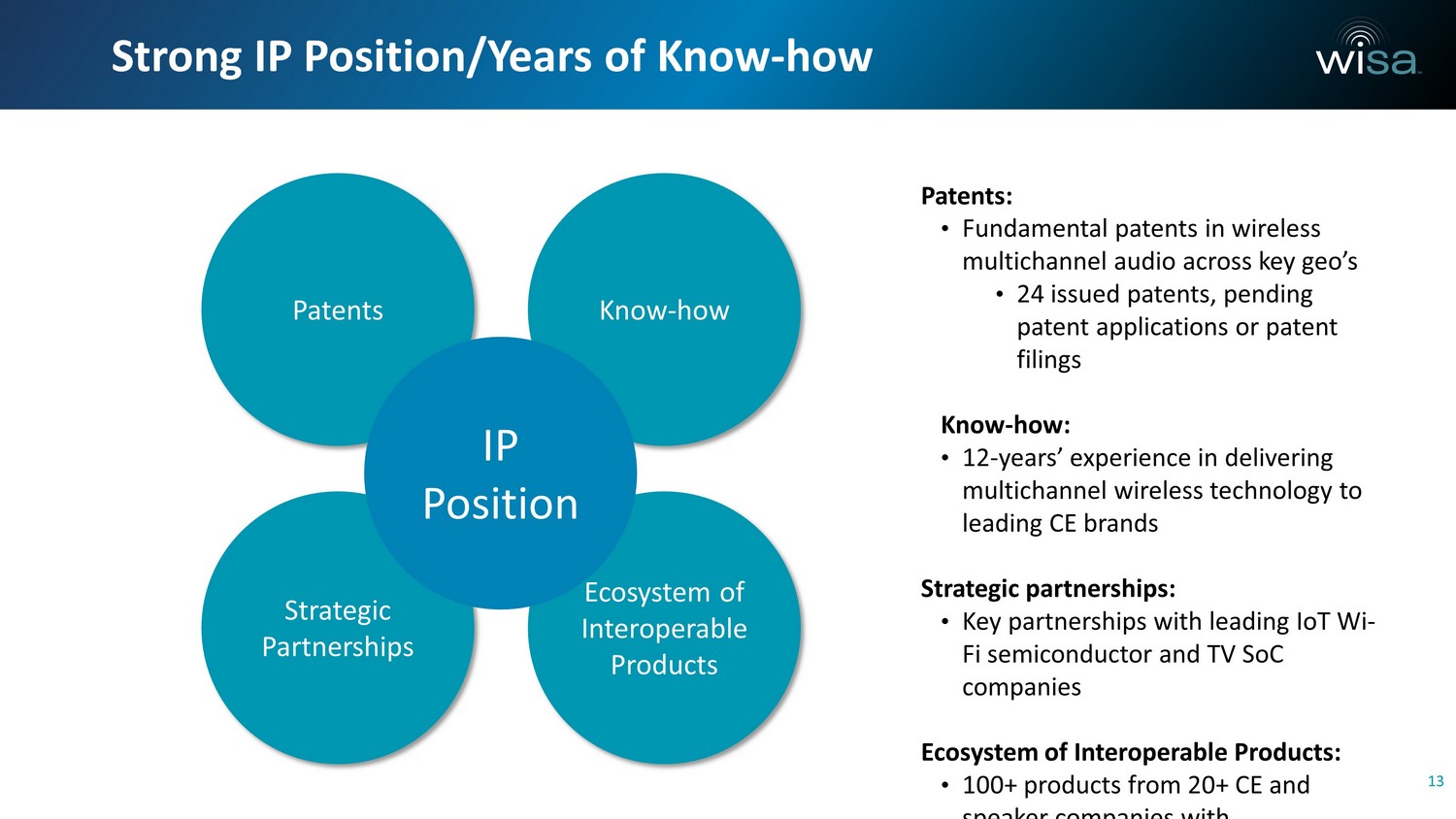 Strong IP Position/Years of Know - how Patents Know - how Strategic Partnerships Ecosystem of Interoperable Products IP Position Patents: • Fundamental patents in wireless multichannel audio across key geo’s • 24 issued patents, pending patent applications or patent filings Know - how: • 12 - years’ experience in delivering multichannel wireless technology to leading CE brands Strategic partnerships: • Key partnerships with leading IoT Wi - Fi semiconductor and TV SoC companies Ecosystem of Interoperable Products: • 100+ products from 20+ CE and speaker companies with 13