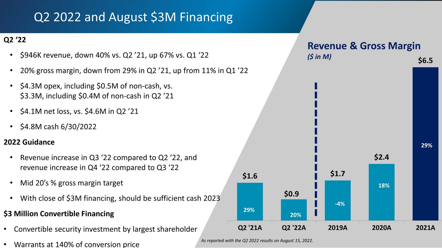 Q2 2022 and August $3M Financing $1.6 $0.9 $1.7 $2.4 $6.5 Q2 '21A Q2 '22A 2019A 2020A 2021A 18% 29% Revenue & Gross Margin ($ in M) - 4% 29 % As reported with the Q2 2022 results on August 15, 2022. 20% Q2 ‘22 • $946 K revenue, down 40 % vs. Q2 ’21, up 67% vs. Q1 ‘ 22 • 20% gross margin, dow n from 29% in Q2 ’21, up from 11% in Q1 ’22 • $ 4.3 M opex , including $0.5M of non - cash, vs. $3.3M, including $0 .4 M of non - cash in Q2 ’21 • $ 4.1 M net loss, vs. $4.6M in Q2 ’21 • $ 4.8 M cash 6/30/2022 2022 Guidance • Revenue increase in Q3 ‘ 22 compared to Q2 ‘ 22, and revenue increase in Q4 ‘ 22 compared to Q3 ‘ 22 • Mid 20’s % gross margin target • With close of $3M financing, should be s ufficient cash 2023 $3 Million Convertible Financing • Convertible security investment by largest shareholder • Warrants at 140% of conversion price