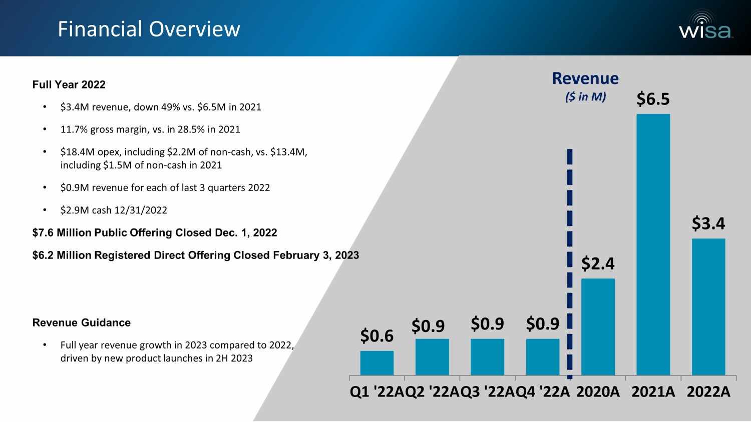 Overview of Business • WiSA E is a compelling technology advancement • WiSA DS is being specified for design and building of SB • Marketing focused immersive audio products with Atmos upfiring speakers • Consumer electronics industry is still in a slump from overbuilding and weak consumer demand • Operation Expenses will drop by $1M+ from Q4 to Q1 • Expect Revenue growth YOY for full year 2023