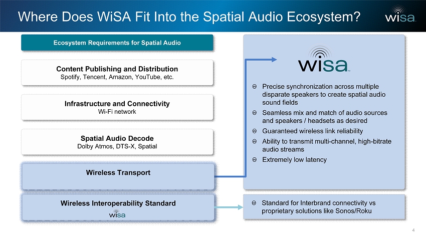 Where Does WiSA Fit Into the Spatial Audio Ecosystem? 4 Standard for Interbrand connectivity vs proprietary solutions like Sonos/Roku Content Publishing and Distribution Spotify, Tencent, Amazon, YouTube, etc. Infrastructure and Connectivity Wi - Fi network Spatial Audio Decode Dolby Atmos, DTS - X, Spatial Ecosystem Requirements for Spatial Audio Wireless Interoperability Standard Precise synchronization across multiple disparate speakers to create spatial audio sound fields Seamless mix and match of audio sources and speakers / headsets as desired Guaranteed wireless link reliability Ability to transmit multi - channel, high - bitrate audio streams Extremely low latency Wireless Transport