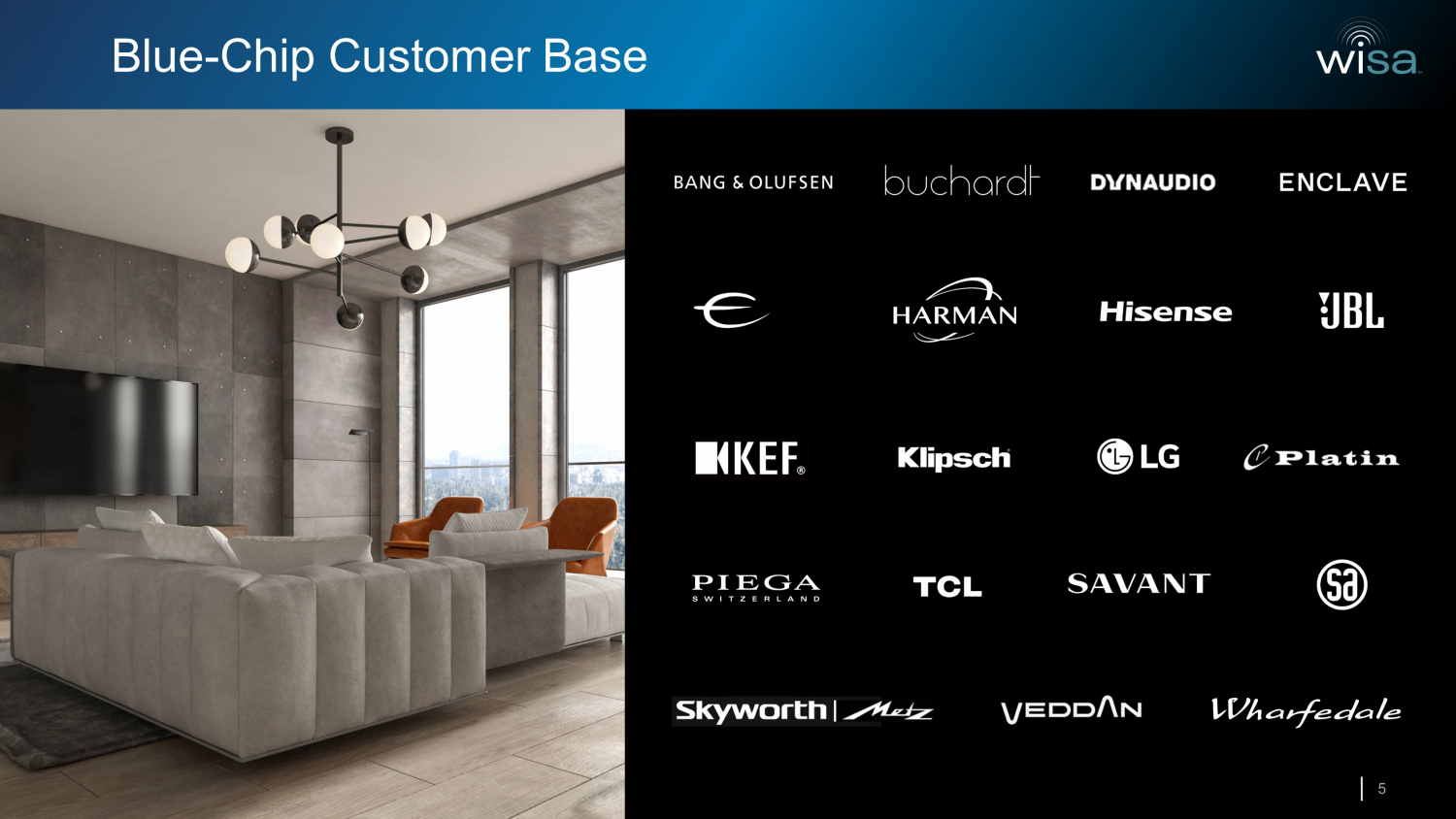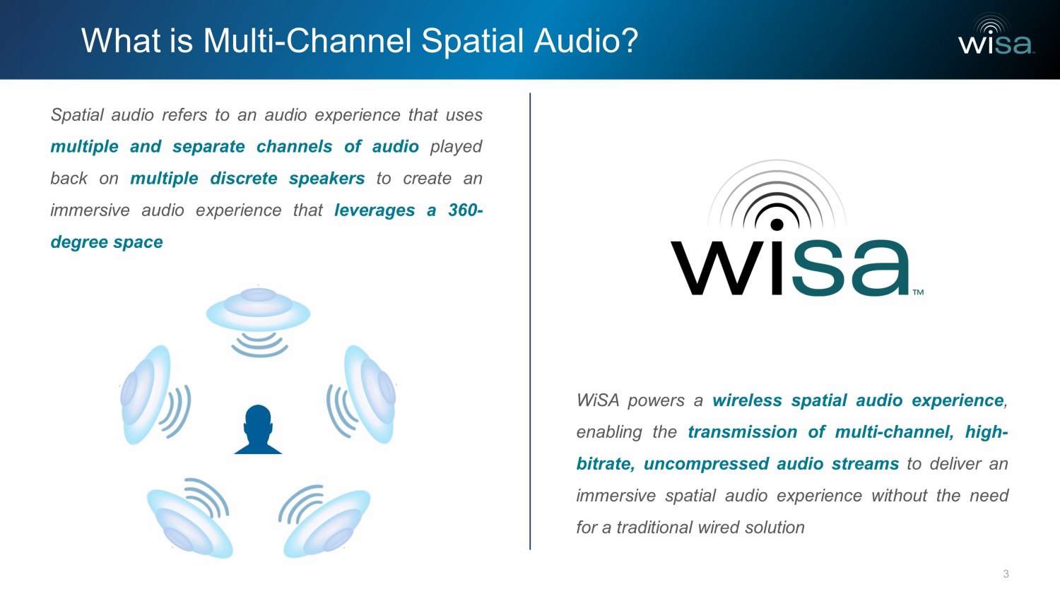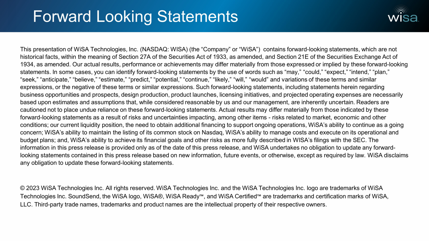 Forward Looking Statements This presentation of WiSA Technologies, Inc. (NASDAQ: WISA) (the “Company” or “ WiSA ”) contains forward - looking statements, which are not historical facts, within the meaning of Section 27A of the Securities Act of 1933, as amended, and Section 21E of the Securit ies Exchange Act of 1934, as amended. Our actual results, performance or achievements may differ materially from those expressed or implied by th ese forward - looking statements. In some cases, you can identify forward - looking statements by the use of words such as “may,” “could,” “expect,” “in tend,” “plan,” “seek,” “anticipate,” “believe,” “estimate,” “predict,” “potential,” “continue,” “likely,” “will,” “would” and variations of the se terms and similar expressions, or the negative of these terms or similar expressions. Such forward - looking statements, including statements herein regarding business opportunities and prospects, design production, product launches, licensing initiatives, and projected operating exp ens es are necessarily based upon estimates and assumptions that, while considered reasonable by us and our management, are inherently uncertain. Readers are cautioned not to place undue reliance on these forward - looking statements. Actual results may differ materially from those indic ated by these forward - looking statements as a result of risks and uncertainties impacting, among other items - risks related to market, econom ic and other conditions; our current liquidity position, the need to obtain additional financing to support ongoing operations, WiSA’s ability to continue as a going concern; WiSA’s ability to maintain the listing of its common stock on Nasdaq, WiSA’s ability to manage costs and execute on its operational and budget plans; and, WiSA’s ability to achieve its financial goals and other risks as more fully described in WISA’s filings with the SEC. The information in this press release is provided only as of the date of this press release, and WiSA undertakes no obligation to update any forward - looking statements contained in this press release based on new information, future events, or otherwise, except as required by law. WiSA disclaims any obligation to update these forward - looking statements. © 2023 WiSA Technologies Inc. All rights reserved. WiSA Technologies Inc. and the WiSA Technologies Inc. logo are trademarks of WiSA Technologies Inc. SoundSend , the WiSA logo, WiSA ®, WiSA Ready Ρ , and WiSA Certified Ρ are trademarks and certification marks of WiSA , LLC. Third - party trade names, trademarks and product names are the intellectual property of their respective owners.