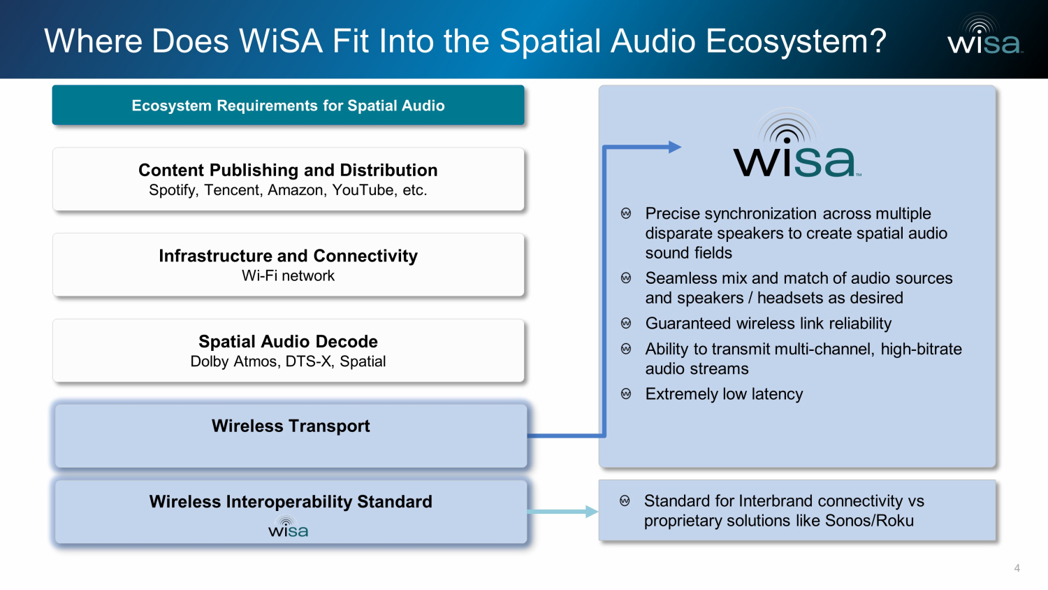 Where Does WiSA Fit Into the Spatial Audio Ecosystem? 4 Standard for Interbrand connectivity vs proprietary solutions like Sonos/Roku Content Publishing and Distribution Spotify, Tencent, Amazon, YouTube, etc. Infrastructure and Connectivity Wi - Fi network Spatial Audio Decode Dolby Atmos, DTS - X, Spatial Ecosystem Requirements for Spatial Audio Wireless Interoperability Standard Precise synchronization across multiple disparate speakers to create spatial audio sound fields Seamless mix and match of audio sources and speakers / headsets as desired Guaranteed wireless link reliability Ability to transmit multi - channel, high - bitrate audio streams Extremely low latency Wireless Transport