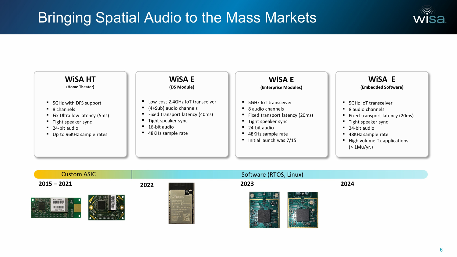 Key Highlights World - class premium technology porte d to low - cost IoT chips to address mass market audio systems with software roadmap to address TAM of over 2 billion units 3 Establishment and management of the Wireless Speaker and Audio Association ( WiSA , LLC) with interoperability specification, testing, and compliance standard 4 30+ brands have designed WiSA technologies into their products 5 WiSA E market opportunity to unify market for wireless audio solutions for TVs and soundbars that is software based and interoperable 2 Strong IP position and significant patent coverage for immersive audio, with highly - differentiated multichannel wireless audio technology and existing implementations in premium audio brands 1 13