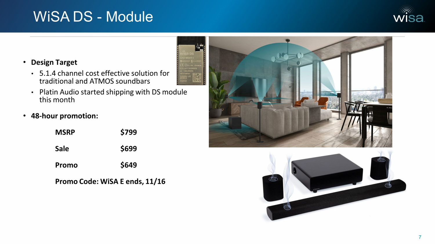 Bringing Spatial Audio to the Mass Markets 6 2015 – 2021 2022 2023 2024 Custom ASIC Software (RTOS, Linux) WiSA HT (Home Theater) WiSA E (DS Module) WiSA E (Enterprise Modules) WiSA E (Embedded Software) ▪ 5GHz with DFS support ▪ 8 channels ▪ Fix Ultra low latency (5ms) ▪ Tight speaker sync ▪ 24 - bit audio ▪ Up to 96KHz sample rates ▪ Low - cost 2.4GHz IoT transceiver ▪ (4+Sub) audio channels ▪ Fixed transport latency (40ms) ▪ Tight speaker sync ▪ 16 - bit audio ▪ 48KHz sample rate ▪ 5GHz IoT transceiver ▪ 8 audio channels ▪ Fixed transport latency (20ms) ▪ Tight speaker sync ▪ 24 - bit audio ▪ 48KHz sample rate ▪ Initial launch was 7/15 ▪ 5GHz IoT transceiver ▪ 8 audio channels ▪ Fixed transport latency (20ms) ▪ Tight speaker sync ▪ 24 - bit audio ▪ 48KHz sample rate ▪ High volume Tx applications (> 1Mu/yr.)