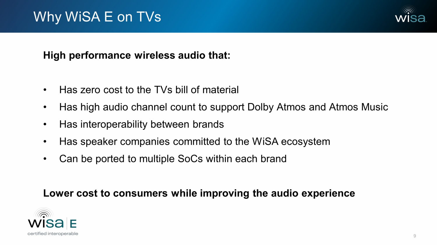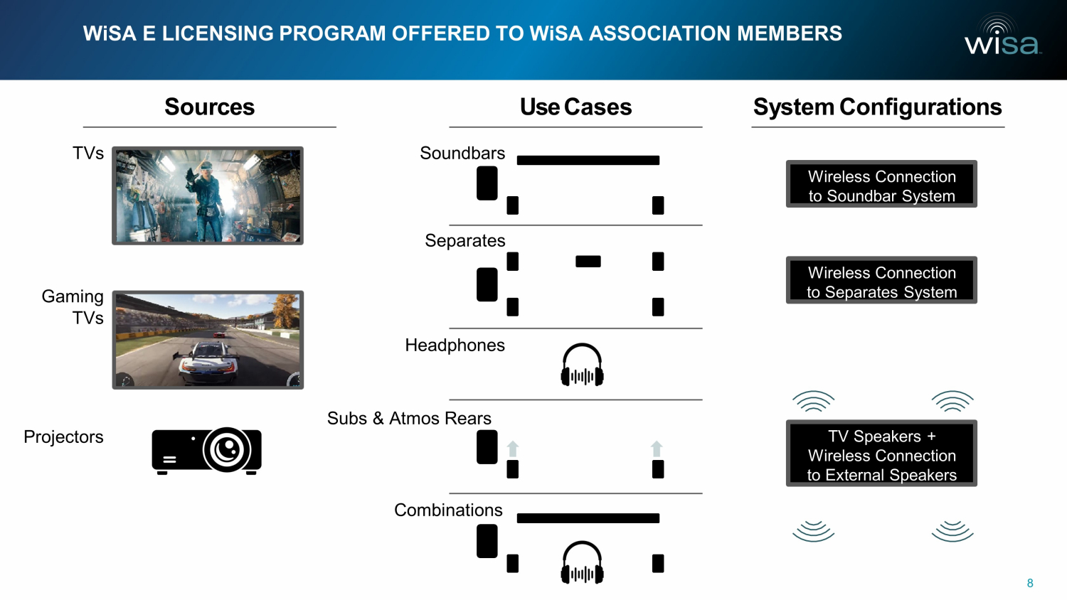 Sources WiSA E LICENSING PROGRAM OFFERED TO WiSA ASSOCIATION MEMBERS TVs Gaming TVs Use Cases System Configurations Soundbars Separates Headphones Subs & Atmos Rears TV Speakers + Wireless Connection to External Speakers Projectors Combinations Wireless Connection to Separates System Wireless Connection to Soundbar System 8