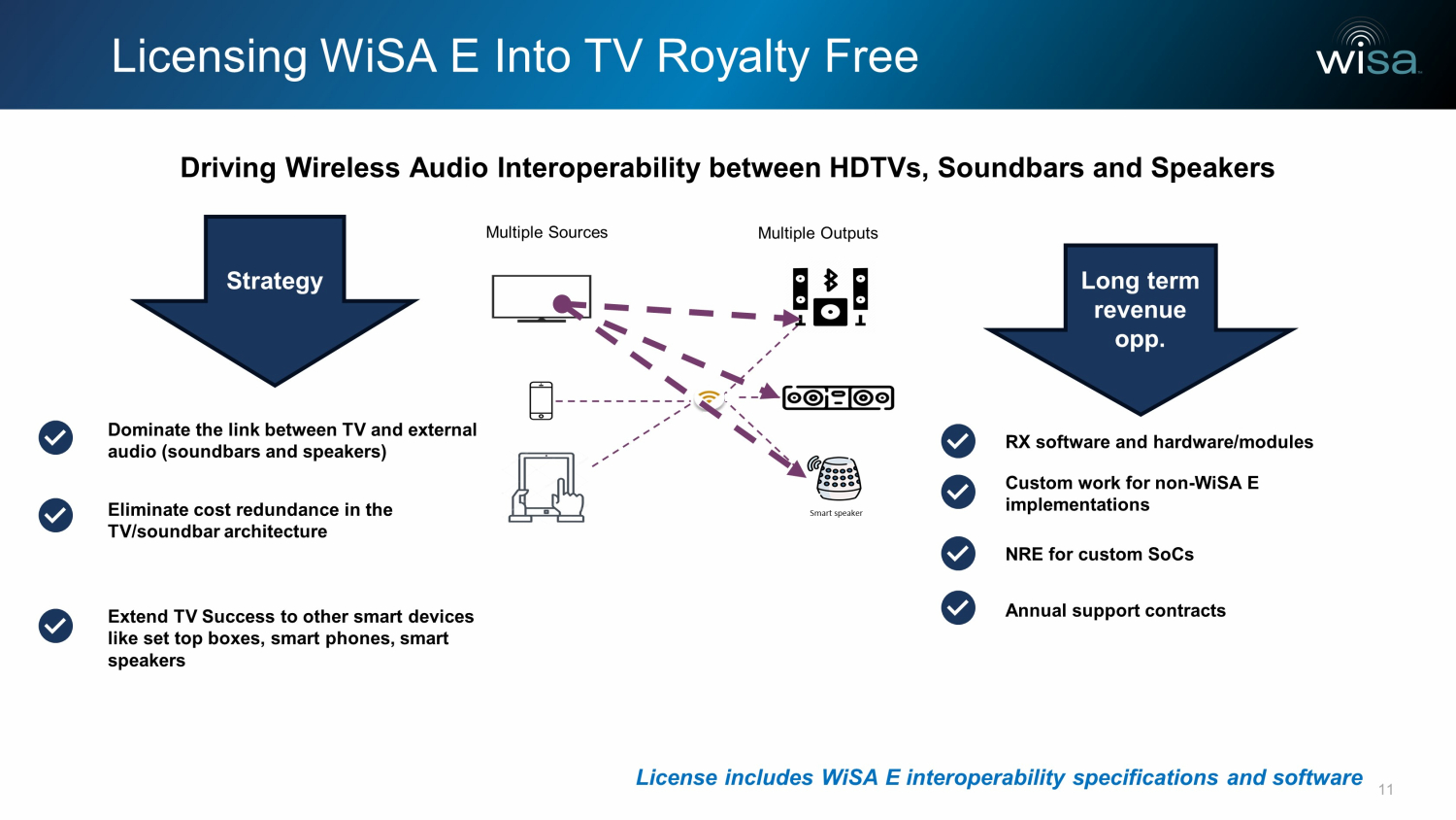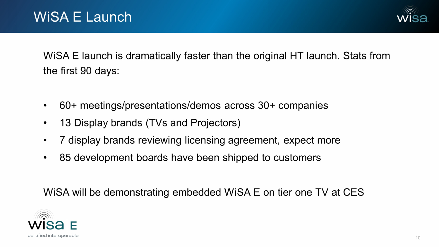 WiSA E Launch WiSA E launch is dramatically faster than the original HT launch. Stats from the first 90 days: • 60+ meetings/presentations/demos across 30+ companies • 13 Display brands (TVs and Projectors) • 7 display brands reviewing licensing agreement, expect more • 85 development boards have been shipped to customers WiSA will be demonstrating embedded WiSA E on tier one TV at CES 10