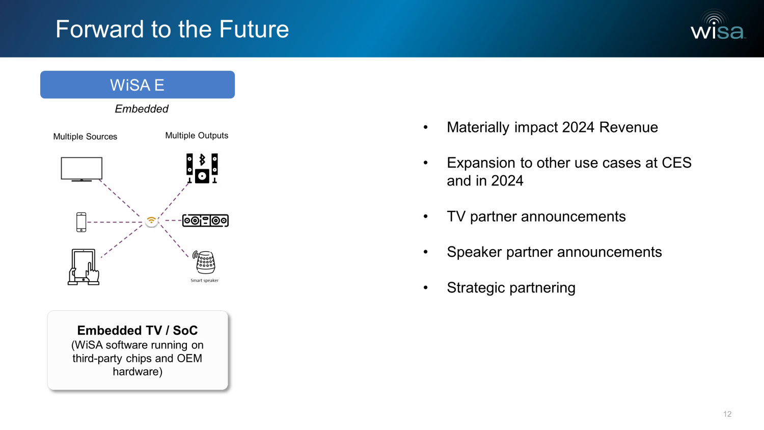 Licensing WiSA E Into TV Royalty Free 11 Dominate the link between TV and external audio (soundbars and speakers) Extend TV Success to other smart devices like set top boxes, smart phones, smart speakers Eliminate cost redundance in the TV/soundbar architecture Driving Wireless Audio Interoperability between HDTVs, Soundbars and Speakers RX software and hardware/modules Custom work for non - WiSA E implementations License includes WiSA E interoperability specifications and software Annual support contracts NRE for custom SoCs Long term revenue opp. Multiple Outputs Smart speaker Strategy Multiple Sources