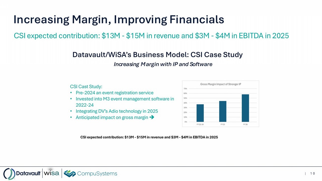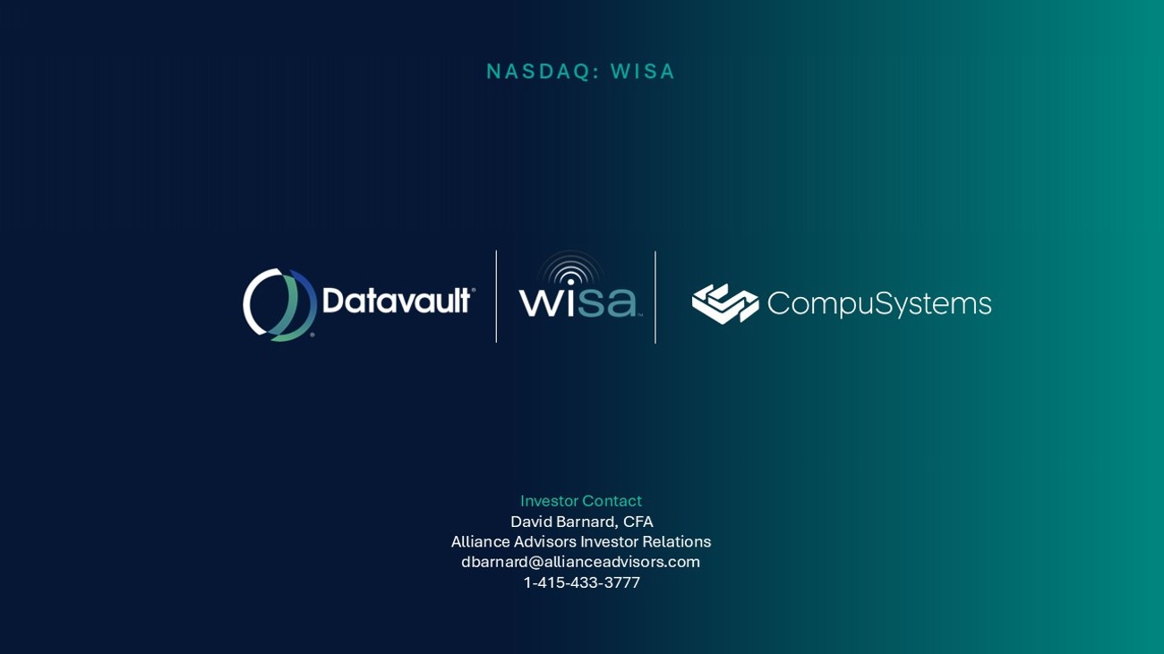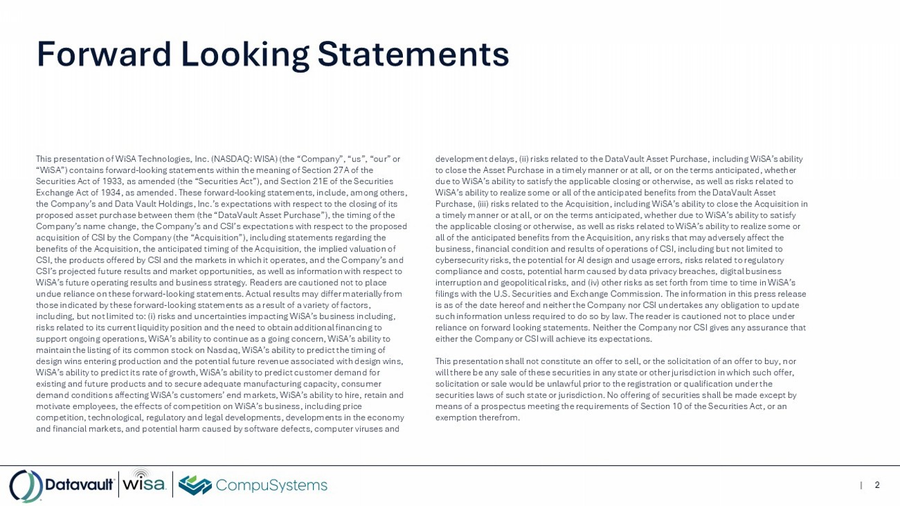 | 2 Forward Looking Statements This presentation of WiSA Technologies, Inc. (NASDAQ: WISA) (the "Company", "us", "our" or "WiSA") contains forward-looking statements within the meaning of Section 27A of the Securities Act of 1933, as amended (the "Securities Act"), and Section 21E of the Securities Exchange Act of 1934, as amended. These forward-looking statements, include, among others, the Company's and Data Vault Holdings, Inc.'s expectations with respect to the closing of its proposed asset purchase between them (the "DataVault Asset Purchase"), the timing of the Company's name change, the Company's and CSI's expectations with respect to the proposed acquisition of CSI by the Company (the "Acquisition"), including statements regarding the benefits of the Acquisition, the anticipated timing of the Acquisition, the implied valuation of CSI, the products offered by CSI and the markets in which it operates, and the Company's and CSI's projected future results and market opportunities, as well as information with respect to WiSA's future operating results and business strategy. Readers are cautioned not to place undue reliance on these forward-looking statements. Actual results may differ materially from those indicated by these forward-looking statements as a result of a variety of factors, including, but not limited to: (i) risks and uncertainties impacting WiSA's business including, risks related to its current liquidity position and the need to obtain additional financing to support ongoing operations, WiSA's ability to continue as a going concern, WiSA's ability to maintain the listing of its common stock on Nasdaq, WiSA's ability to predict the timing of design wins entering production and the potential future revenue associated with design wins, WiSA's ability to predict its rate of growth, WiSA's ability to predict customer demand for existing and future products and to secure adequate manufacturing capacity, consumer demand conditions affecting WiSA's customers' end markets, WiSA's ability to hire, retain and motivate employees, the effects of competition on WiSA's business, including price competition, technological, regulatory and legal developments, developments in the economy and financial markets, and potential harm caused by software defects, computer viruses and development delays, (ii) risks related to the DataVault Asset Purchase, including WiSA's ability to close the Asset Purchase in a timely manner or at all, or on the terms anticipated, whether due to WiSA's ability to satisfy the applicable closing or otherwise, as well as risks related to WiSA's ability to realize some or all of the anticipated benefits from the DataVault Asset Purchase, (iii) risks related to the Acquisition, including WiSA's ability to close the Acquisition in a timely manner or at all, or on the terms anticipated, whether due to WiSA's ability to satisfy the applicable closing or otherwise, as well as risks related to WiSA's ability to realize some or all of the anticipated benefits from the Acquisition, any risks that may adversely affect the business, financial condition and results of operations of CSI, including but not limited to cybersecurity risks, the potential for AI design and usage errors, risks related to regulatory compliance and costs, potential harm caused by data privacy breaches, digital business interruption and geopolitical risks, and (iv) other risks as set forth from time to time in WiSA's filings with the U.S. Securities and Exchange Commission. The information in this press release is as of the date hereof and neither the Company nor CSI undertakes any obligation to update such information unless required to do so by law. The reader is cautioned not to place under reliance on forward looking statements. Neither the Company nor CSI gives any assurance that either the Company or CSI will achieve its expectations. This presentation shall not constitute an offer to sell, or the solicitation of an offer to buy, nor will there be any sale of these securities in any state or other jurisdiction in which such offer, solicitation or sale would be unlawful prior to the registration or qualification under the securities laws of such state or jurisdiction. No offering of securities shall be made except by means of a prospectus meeting the requirements of Section 10 of the Securities Act, or an exemption therefrom.