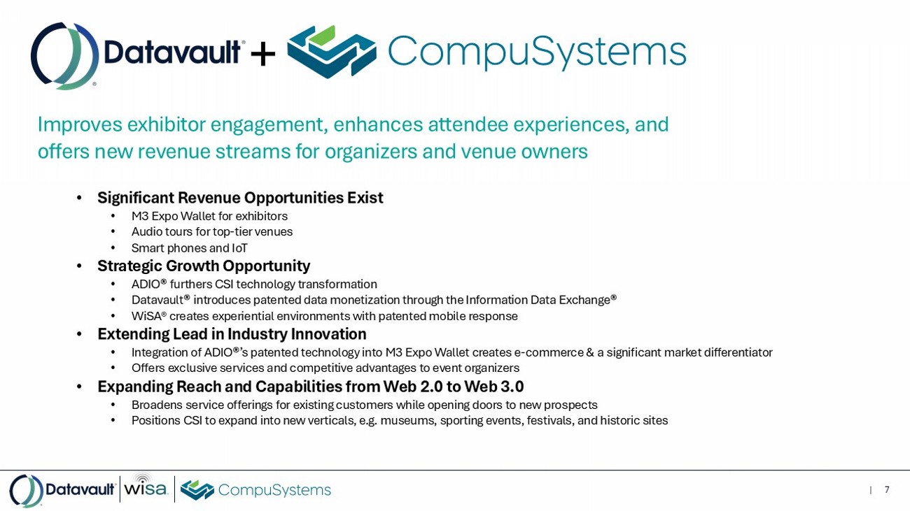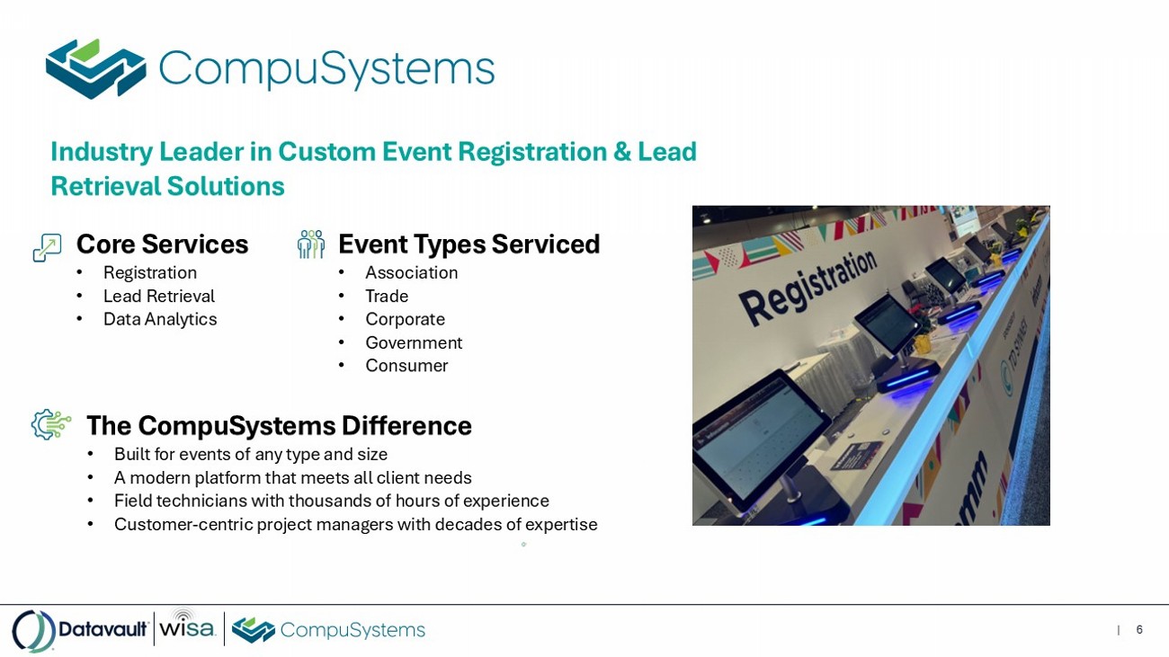| 6 Industry Leader in Custom Event Registration & Lead Retrieva l Solutions Core Services • Registration • Lead Retrieval • Data Analytics Event Types Serviced • Association • Trade • Corporate • Government • Consumer The CompuSystems Difference • Built for events of any type and size • A modern platform that meets all client needs • Field technicians with thousands of hours of experience • Customer - centric project managers with decades of expertise
