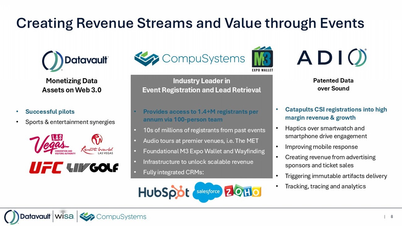 | 7 • Significant Revenue Opportunities Exist • M3 Expo Wallet for exhibitors • Audio tours for top - tier venues • Smart phones and IoT • Strategic Growth Opportunity • ADIO ® furthers CSI technology transformation • Datavault ® introduces patented data monetization through the Information Data Exchange ® • WiSA® creates experiential environments with patented mobile response • Extending Lead in Industry Innovation • Integration of ADIO ® ’s patented technology into M3 Expo Wallet creates e - commerce & a significant market differentiator • Offers exclusive services and competitive advantages to event organizers • Expanding Reach and Capabilities from Web 2.0 to Web 3.0 • Broadens service offerings for existing customers while opening doors to new prospects • Positions CSI to expand into new verticals, e.g. museums, sporting events, festivals, and historic sites Improves exhibitor engagement, enhances attendee experiences, and offers new revenue streams for organizers and venue owners +