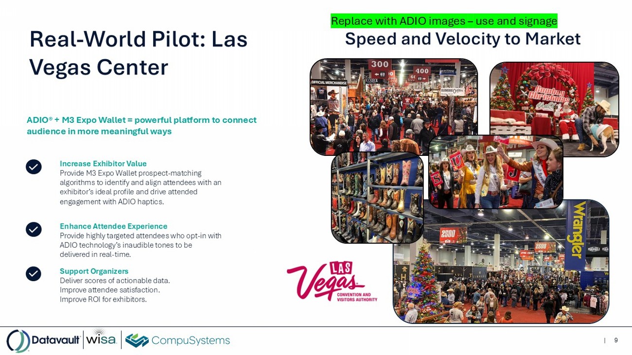 | 8 Patented Data over Sound • Catapults CSI registrations into high margin revenue & growth • Haptics over smartwatch and smartphone drive engagement • Improving mobile response • Creating revenue from advertising sponsors and ticket sales • Triggering immutable artifacts delivery • Tracking, tracing and analytics Industry Leader in Event Registration and Lead Retrieval • Provides access to 1.4+M registrants per annum via 100 - person team • 10s of millions of registrants from past events • Audio tours at premier venues, i.e. The MET • Foundational M3 Expo Wallet and Wayfinding • Infrastructure to unlock scalable revenue • Fully integrated CRMs: Monetizing Data Assets on Web 3.0 • Successful pilots • Sports & entertainment synergies Creating Revenue Streams and Value through Events