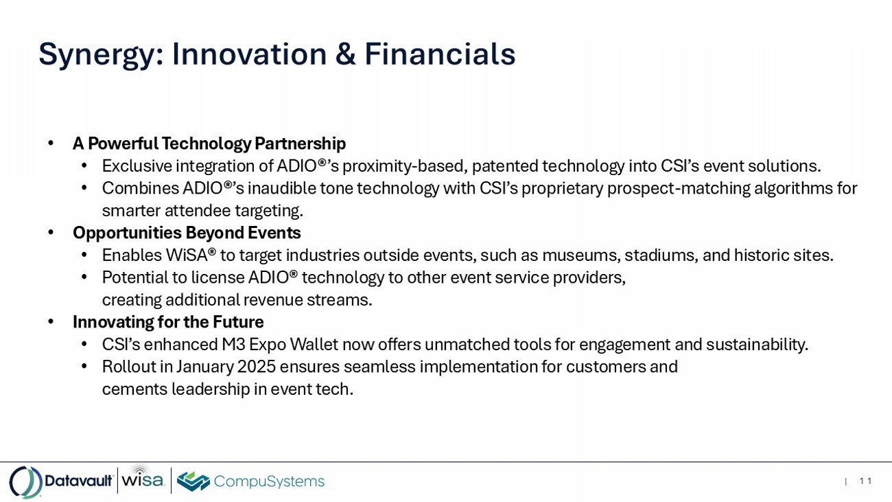 | 11 • A Powerful Technology Partnership • Exclusive integration of ADIO ® ’s proximity - based, patented technology into CSI’s event solutions. • Combines ADIO ® ’s inaudible tone technology with CSI’s proprietary prospect - matching algorithms for smarter attendee targeting. • Opportunities Beyond Events • Enables WiSA ® to target industries outside events, such as museums, stadiums, and historic sites. • Potential to license ADIO ® technology to other event service providers, creating additional revenue streams. • Innovating for the Future • CSI’s enhanced M3 Expo Wallet now offers unmatched tools for engagement and sustainability. • Rollout in January 2025 ensures seamless implementation for customers and cements leadership in event tech. Synergy: Innovation & Financials