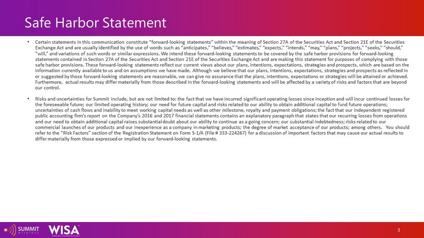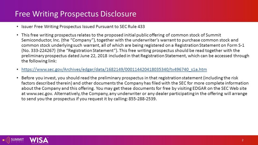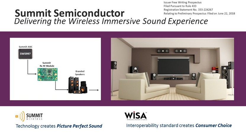 Summit Semiconductor Delivering the Wireless Immersive Sound Experience Technology creates Picture Perfect Sound Interoperability standard creates Consumer Choice Summit Rx RF Module Summit ASIC Branded Speakers SWS997 Issuer Free Writing Prospectus Filed Pursuant to Rule 433 Registration Statement No. 333 - 224267 Relating to Preliminary Prospectus Filed on June 22, 2018