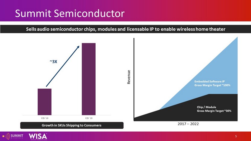 Deal Summary 4 Issuer Summit Semiconductor Co - Leads Alexander Capital, LP & R.F. Lafferty & Co., Inc. Ticker/Exchange WISA/NASDAQ Offering Size $15,000,000 Pricing Range $5 - $7 / share Shares Offered 2,500,000 Use of Proceeds • Product development • Sales, marketing, general and administrative • Debt repayment • Capital expenditures • General working capital purposes