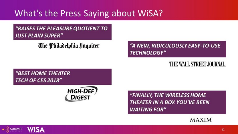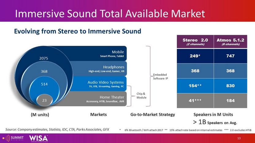 What’s the Press Saying about WiSA? 12 “FINALLY, THE WIRELESS HOME THEATER IN A BOX YOU'VE BEEN WAITING FOR” “A NEW, RIDICULOUSLY EASY - TO - USE TECHNOLOGY” “RAISES THE PLEASURE QUOTIENT TO JUST PLAIN SUPER” “BEST HOME THEATER TECH OF CES 2018”