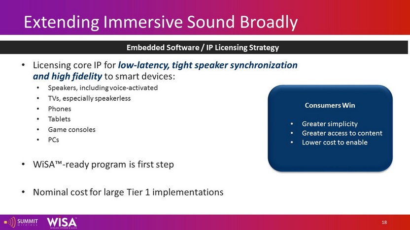 Competitive Advantages Wireless Attributes Bluetooth WiFi WiSA™ Technology Multi - channel Up to 8 Separate Audio Channels Lip - sync Video Content Requirement Speakers Synchronized Eliminates Phase Distortion High Fidelity Support latest content formats up 24bit/96k sample rates Expandable Over Time Scalability Built into Technology Brand Interoperability Brand Specific WiSA™ Test Specification Robust Wireless Connection Avoids Network Congestion Supports UNII RF Bands Simple Setup < 30 minute Home Theater Setup Low Integration Cost No Multi - Channel Direct Competitor 17 SIMPLICITY WINS! Simple set - ups requiring no expertise and very little time Stereo Only Source: Summit’s Technical Summary