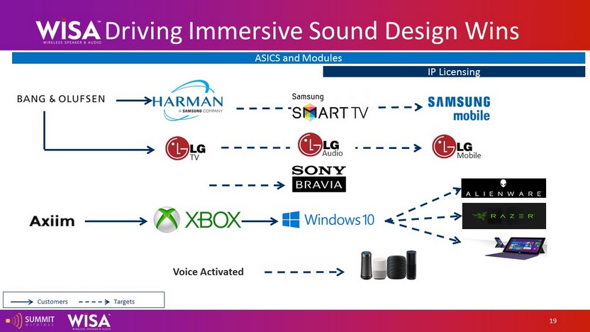 Extending Immersive Sound Broadly • Licensing core IP for low - latency, tight speaker synchronization and high fidelity to smart devices: • Speakers, including voice - activated • TVs, especially speakerless • Phones • Tablets • Game consoles • PCs • WiSA™ - ready program is first step • Nominal cost for large Tier 1 implementations 18 Embedded Software / IP Licensing Strategy Consumers Win • Greater simplicity • Greater access to content • Lower cost to enable