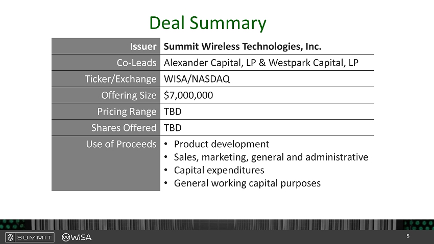 Forward - Looking Statements This presentation includes forward - looking statements within the meaning of the Private Securities Litigation Reform Act that reflect our current views with respect to, among other things, our operations, business strategy, interpretation of prior development activities, plans to develop and commercialize our product candidates, potential market opportunity, financial performance and needs for additional financing. We have used words like "anticipate," "believe," "could," "estimate," "expect," "future," "intend," "may," "plan," "potential," "project," "will," and similar terms and phrases to identify forward - looking statements in this presentation. Readers are cautioned not to place undue reliance on these forward - looking statements. Actual results may differ materially from those indicated by these forward - looking statements as a result of risks and uncertainties impacting Summit Wireless’ business, including the ability to predict the timing of design wins entering production and the potential future revenue associated with design wins; rate of growth; the ability to predict customer demand for existing and future products and to secure adequate manufacturing capacity; consumer demand conditions affecting customers’ end markets; the ability to hire, retain and motivate employees; the effects of competition, including price competition; technological, regulatory and legal developments; developments in the economy and financial markets and other risks detailed from time to time in Summit Wireless’ filings with the Securities and Exchange Commission, including those described in our Registration Statement on Form S - 1 filed with the SEC on April 19 , 2019. Forward - looking statements speak only as of the date of this presentation, and we undertake no obligation to review or update any forward - looking statement except as may be required by applicable law. 4