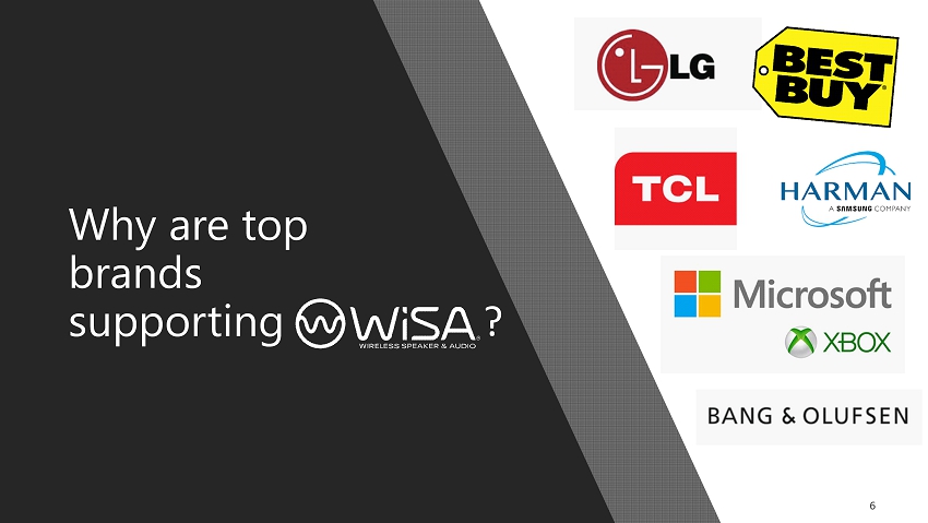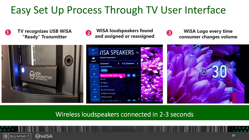 WiSA Embedded IP Eliminating Adoption Costs WiSA “Ready” WiSA Traditional TV HDMI WIFI Bluetooth Dolby A/V Receiver Installation Installation Cost/Time WiSA Hub/ Soundbar WiSA USB Transmitter or WiSA Xbox Transmitter $1,500+ $300 - $800 $75 - $150 $1 HDMI WIFI Bluetooth Dolby Cost to consumer: 15