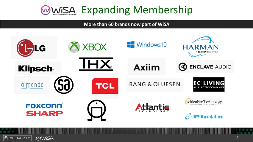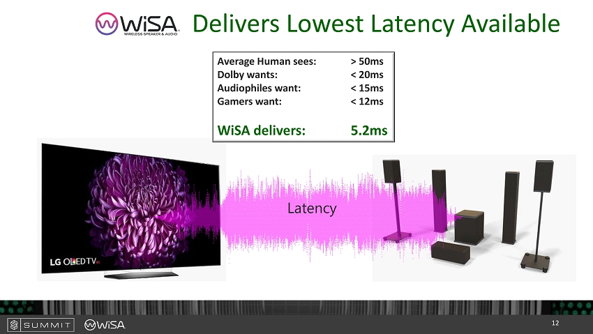 Latency A verage Human sees: > 50ms Dolby wants: < 20ms Audiophiles want: < 15ms Gamers want: < 12ms WiSA delivers: 5.2ms Delivers Lowest Latency Available 12