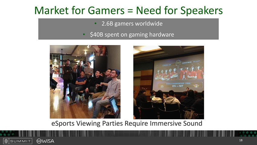 Market for Gamers = Need for Speakers • 2.6B gamers worldwide • $40B spent on gaming hardware eSports Viewing Parties Require Immersive Sound 18