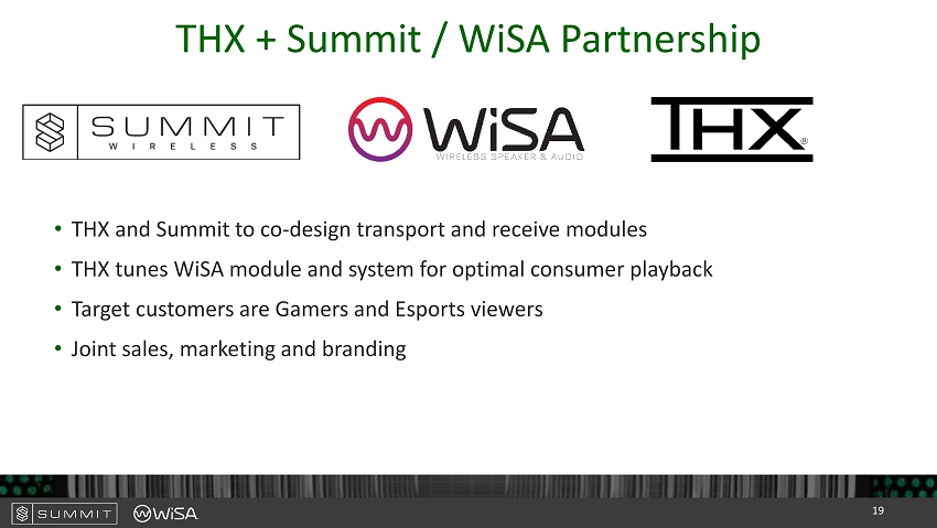 THX + Summit / WiSA Partnership • THX and Summit to co - design transport and receive modules • THX tunes WiSA module and system for optimal consumer playback • Target customers are Gamers and Esports viewers • Joint sales, marketing and branding 19