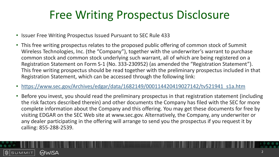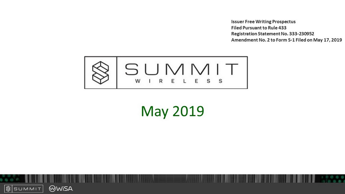 Free Writing Prospectus Disclosure • Issuer Free Writing Prospectus Issued Pursuant to SEC Rule 433 • This free writing prospectus relates to the proposed public offering of common stock of Summit Wireless Technologies, Inc. (the “Company”), together with the underwriter’s warrant to purchase common stock and common stock underlying such warrant, all of which are being registered on a Registration Statement on Form S - 1 ( No. 333 - 230952) (as amended the “Registration Statement”). This free writing prospectus should be read together with the preliminary prospectus included in that Registration Statement, which can be accessed through the following link: • https://www.sec.gov/Archives/edgar/data/1682149/000114420419027142/tv521941_s1a. htm • Before you invest, you should read the preliminary prospectus in that registration statement (including the risk factors described therein) and other documents the Company has filed with the SEC for more complete information about the Company and this offering. You may get these documents for free by visiting EDGAR on the SEC Web site at www.sec.gov. Alternatively, the Company, any underwriter or any dealer participating in the offering will arrange to send you the prospectus if you request it by calling: 855 - 288 - 2539. 2