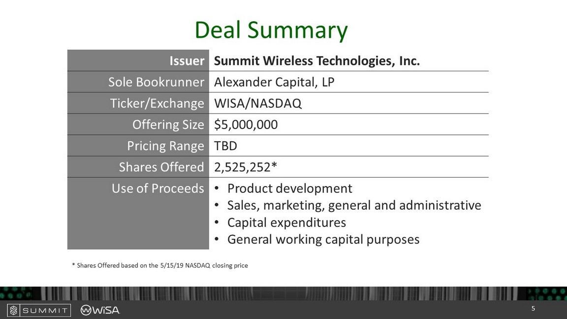 Forward - Looking Statements This presentation includes forward - looking statements within the meaning of the Private Securities Litigation Reform Act that reflect our current views with respect to, among other things, our operations, business strategy, interpretation of prior development activities, plans to develop and commercialize our product candidates, potential market opportunity, financial performance and needs for additional financing. We have used words like "anticipate," "believe," "could," "estimate," "expect," "future," "intend," "may," "plan," "potential," "project," "will," and similar terms and phrases to identify forward - looking statements in this presentation. Readers are cautioned not to place undue reliance on these forward - looking statements. Actual results may differ materially from those indicated by these forward - looking statements as a result of risks and uncertainties impacting Summit Wireless’ business, including the ability to predict the timing of design wins entering production and the potential future revenue associated with design wins; rate of growth; the ability to predict customer demand for existing and future products and to secure adequate manufacturing capacity; consumer demand conditions affecting customers’ end markets; the ability to hire, retain and motivate employees; the effects of competition, including price competition; technological, regulatory and legal developments; developments in the economy and financial markets and other risks detailed from time to time in Summit Wireless’ filings with the Securities and Exchange Commission, including those described in our Registration Statement on Form S - 1 as amended, filed with the SEC on May 17, 2019. Forward - looking statements speak only as of the date of this presentation, and we undertake no obligation to review or update any forward - looking statement except as may be required by applicable law. 4