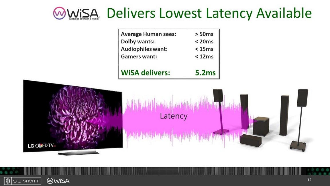Latency A verage Human sees: > 50ms Dolby wants: < 20ms Audiophiles want: < 15ms Gamers want: < 12ms WiSA delivers: 5.2ms Delivers Lowest Latency Available 12