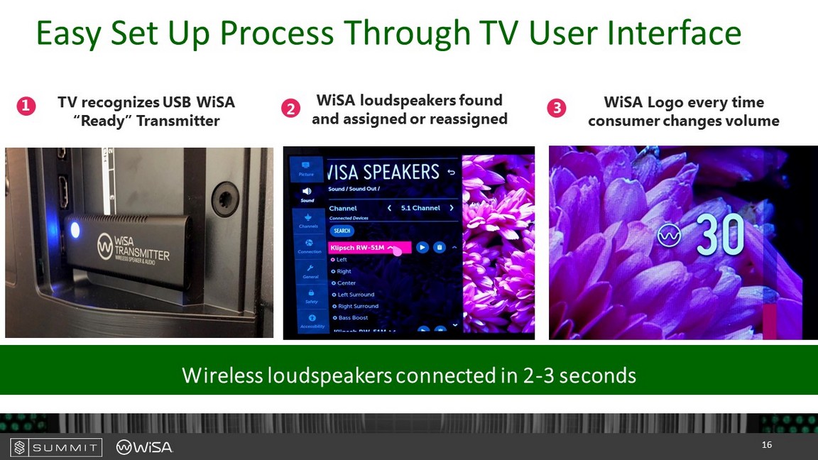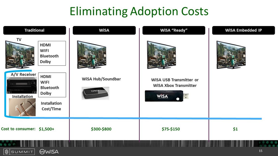 WiSA Embedded IP Eliminating Adoption Costs WiSA “Ready” WiSA Traditional TV HDMI WIFI Bluetooth Dolby A/V Receiver Installation Installation Cost/Time WiSA Hub/ Soundbar WiSA USB Transmitter or WiSA Xbox Transmitter $1,500+ $300 - $800 $75 - $150 $1 HDMI WIFI Bluetooth Dolby Cost to consumer: 15