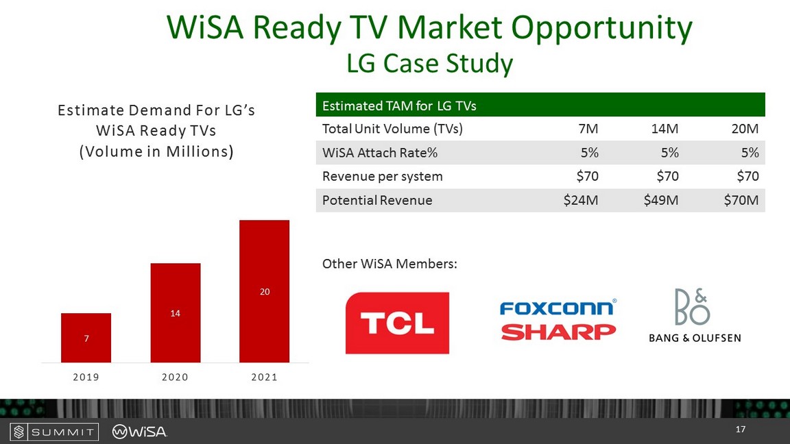 WiSA Ready TV Market Opportunity LG Case Study 7 14 20 2019 2020 2021 Estimate Demand For LG’s WiSA Ready TVs (Volume in Millions ) Total Unit Volume (TVs) 7M 14M 20M WiSA Attach Rate% 5% 5% 5% Revenue per system $70 $70 $70 Potential Revenue $24M $49M $70M Other WiSA Members: Estimated TAM for LG TVs 17