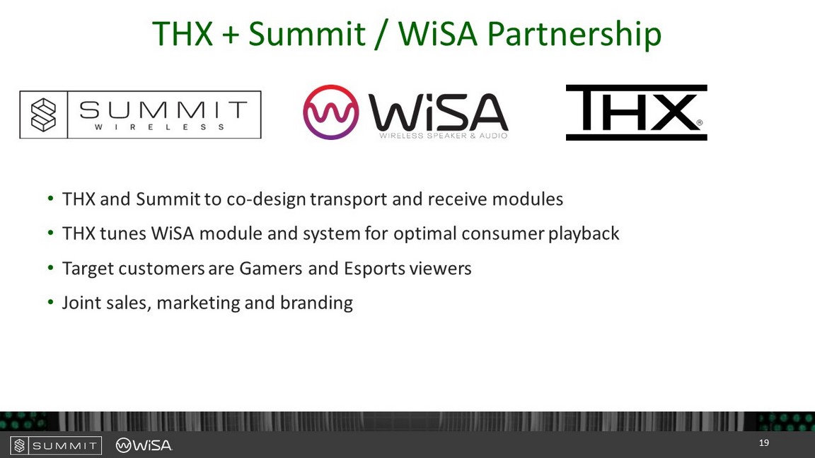 THX + Summit / WiSA Partnership • THX and Summit to co - design transport and receive modules • THX tunes WiSA module and system for optimal consumer playback • Target customers are Gamers and Esports viewers • Joint sales, marketing and branding 19