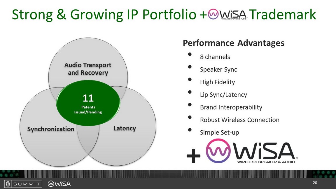 Strong & Growing IP Portfolio + Trademark Audio Transport and Recovery Latency Synchronization 11 Patents Issued/Pending • 8 channels • Speaker Sync • High Fidelity • Lip Sync/Latency • Brand Interoperability • Robust Wireless Connection • Simple Set - up Performance Advantages + 20