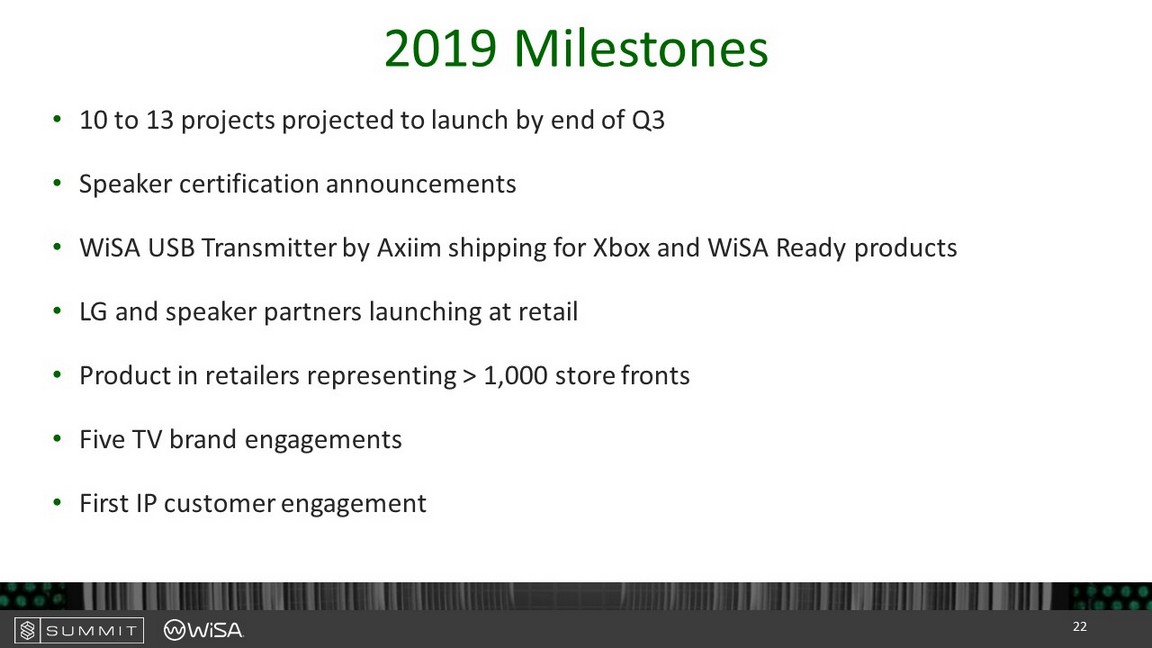 Immersive Sound Expands to All Smart Devices • Developing licensable IP for smart devices: • 150m + Smart TVs • 1B+ Smart Phones • Tablets • Gaming PCs and Consoles • Smart Refrigerator • Prototype demonstrated at CES19 to over 10 tier - one consumer electrics brands Long Term Growth Driver Revenue 2017 – 2022 WiSA Embedded Software IP Gross Margin Target ~100% WiSA Chip / Module Gross Margin Target ~30% 21