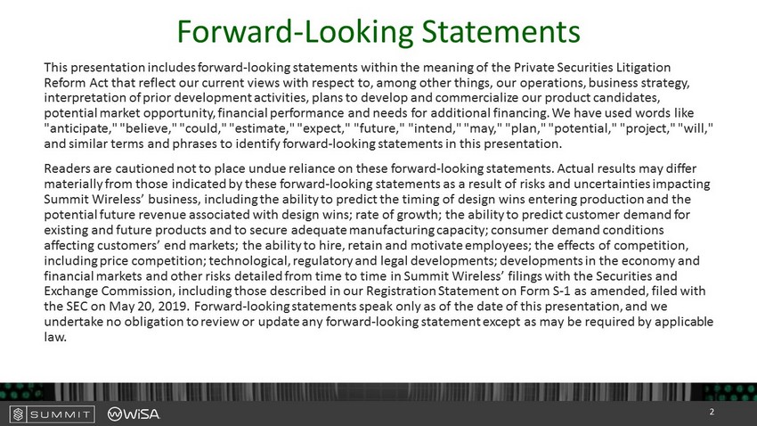 Forward - Looking Statements This presentation includes forward - looking statements within the meaning of the Private Securities Litigation Reform Act that reflect our current views with respect to, among other things, our operations, business strategy, interpretation of prior development activities, plans to develop and commercialize our product candidates, potential market opportunity, financial performance and needs for additional financing. We have used words like "anticipate," "believe," "could," "estimate," "expect," "future," "intend," "may," "plan," "potential," "project," "will," and similar terms and phrases to identify forward - looking statements in this presentation. Readers are cautioned not to place undue reliance on these forward - looking statements. Actual results may differ materially from those indicated by these forward - looking statements as a result of risks and uncertainties impacting Summit Wireless’ business, including the ability to predict the timing of design wins entering production and the potential future revenue associated with design wins; rate of growth; the ability to predict customer demand for existing and future products and to secure adequate manufacturing capacity; consumer demand conditions affecting customers’ end markets; the ability to hire, retain and motivate employees; the effects of competition, including price competition; technological, regulatory and legal developments; developments in the economy and financial markets and other risks detailed from time to time in Summit Wireless’ filings with the Securities and Exchange Commission, including those described in our Registration Statement on Form S - 1 as amended, filed with the SEC on May 20, 2019. Forward - looking statements speak only as of the date of this presentation, and we undertake no obligation to review or update any forward - looking statement except as may be required by applicable law. 2