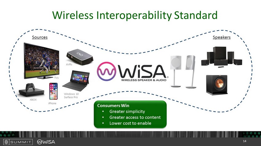 AVRs TVs XBOX Windows 10 Surface Pro Sources Speakers Consumers Win • Greater simplicity • Greater access to content • Lower cost to enable Wireless Interoperability Standard 14 iPhone