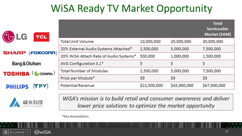 WiSA Embedded IP Eliminating Adoption Costs WiSA “Ready” WiSA Traditional TV HDMI WIFI Bluetooth Dolby A/V Receiver Installation Installation Cost/Time WiSA Hub/ Soundbar WiSA USB Transmitter or WiSA Xbox Transmitter $1,500+ $300 - $800 $75 - $150 $1 HDMI WIFI Bluetooth Dolby Cost to consumer: 15