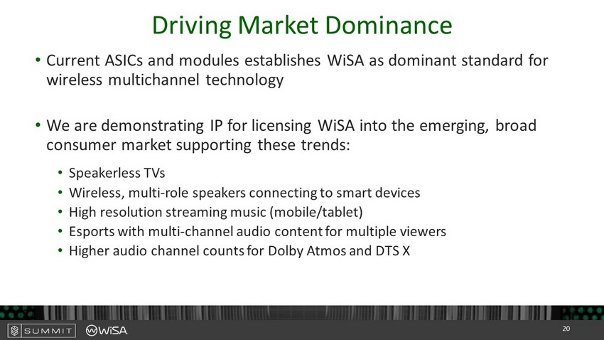 THX + Summit / WiSA Partnership • THX and Summit to co - design transport and receive modules • THX tunes WiSA module and system for optimal consumer playback • Target customers are Gamers and Esports viewers • Joint sales, marketing and branding 19