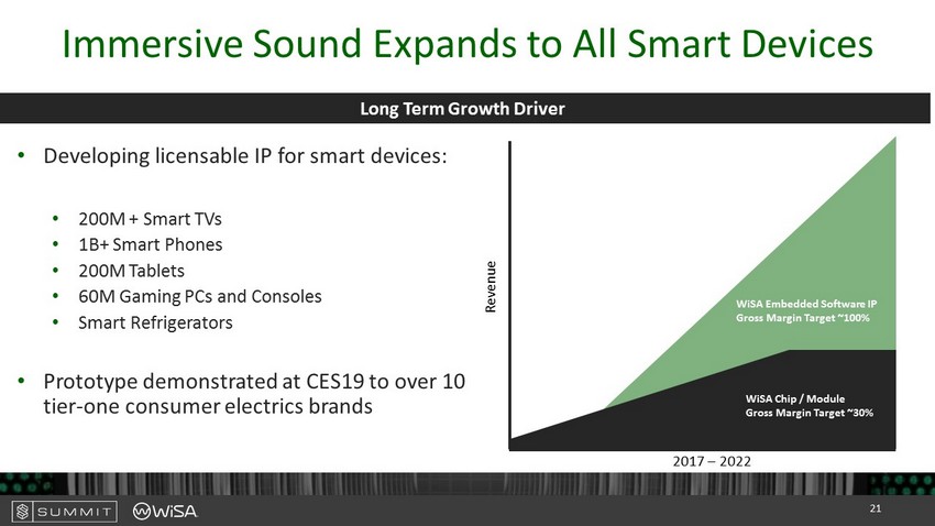 Driving Market Dominance • Current ASICs and modules establishes WiSA as dominant standard for wireless multichannel technology • We are demonstrating IP for licensing WiSA into the emerging, broad consumer market supporting these trends: • Speakerless TVs • Wireless, multi - role speakers connecting to smart devices • High resolution streaming music (mobile/tablet) • Esports with multi - channel audio content for multiple viewers • Higher audio channel counts for Dolby Atmos and DTS X 20