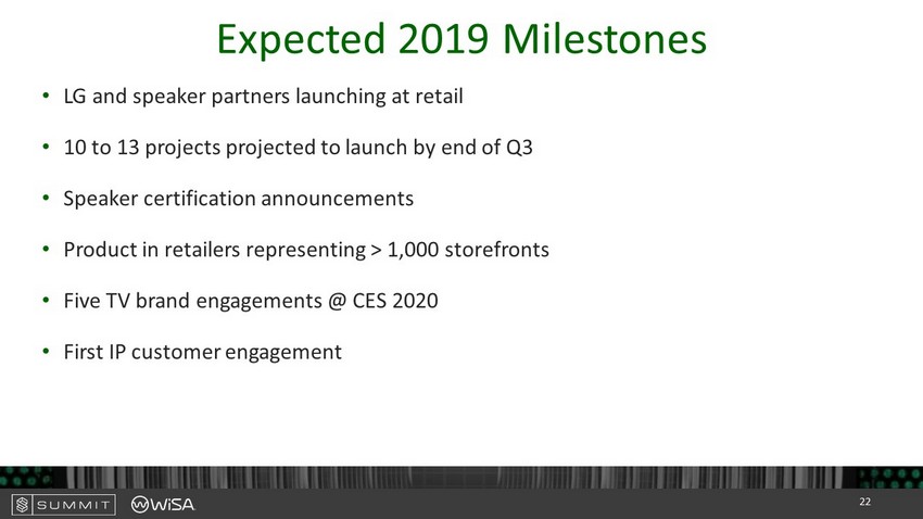 Immersive Sound Expands to All Smart Devices • Developing licensable IP for smart devices: • 200M + Smart TVs • 1B+ Smart Phones • 200M Tablets • 60M Gaming PCs and Consoles • Smart Refrigerators • Prototype demonstrated at CES19 to over 10 tier - one consumer electrics brands Long Term Growth Driver Revenue 2017 – 2022 WiSA Embedded Software IP Gross Margin Target ~100% WiSA Chip / Module Gross Margin Target ~30% 21