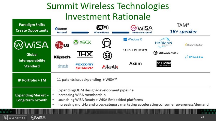 Paradigm Shifts Create Opportunity Global Interoperability Standard IP Portfolio + TM 11 patents issued/pending + WiSA™ Expanding Market = Long - term Growth • Expanding ODM design/development pipeline • Increasing WiSA membership • Launching WiSA Ready + WiSA Embedded platforms • Increasing multi - brand cross - category marketing accelerating consumer awareness/demand Summit Wireless Technologies Investment Rationale Personal Whole House Immersive Sound TAM* 1B+ speaker 23