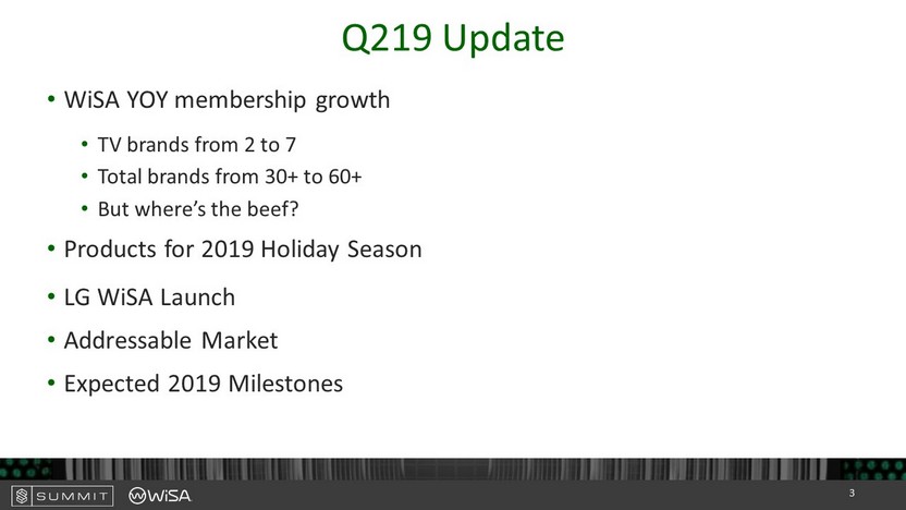 Forward - Looking Statements This presentation includes forward - looking statements within the meaning of the Private Securities Litigation Reform Act that reflect our current views with respect to, among other things, our operations, business strategy, interpretation of prior development activities, plans to develop and commercialize our product candidates, potential market opportunity, financial performance and needs for additional financing. We have used words like "anticipate," "believe," "could," "estimate," "expect," "future," "intend," "may," "plan," "potential," "project," "will," and similar terms and phrases to identify forward - looking statements in this presentation. Readers are cautioned not to place undue reliance on these forward - looking statements. Actual results may differ materially from those indicated by these forward - looking statements as a result of risks and uncertainties impacting Summit Wireless’ business, including the ability to predict the timing of design wins entering production and the potential future revenue associated with design wins; rate of growth; the ability to predict customer demand for existing and future products and to secure adequate manufacturing capacity; consumer demand conditions affecting customers’ end markets; the ability to hire, retain and motivate employees; the effects of competition, including price competition; technological, regulatory and legal developments; developments in the economy and financial markets and other risks detailed from time to time in Summit Wireless’ filings with the Securities and Exchange Commission, including those described in our Registration Statement on Form S - 1 as amended, filed with the SEC on May 20, 2019. Forward - looking statements speak only as of the date of this presentation, and we undertake no obligation to review or update any forward - looking statement except as may be required by applicable law. 2