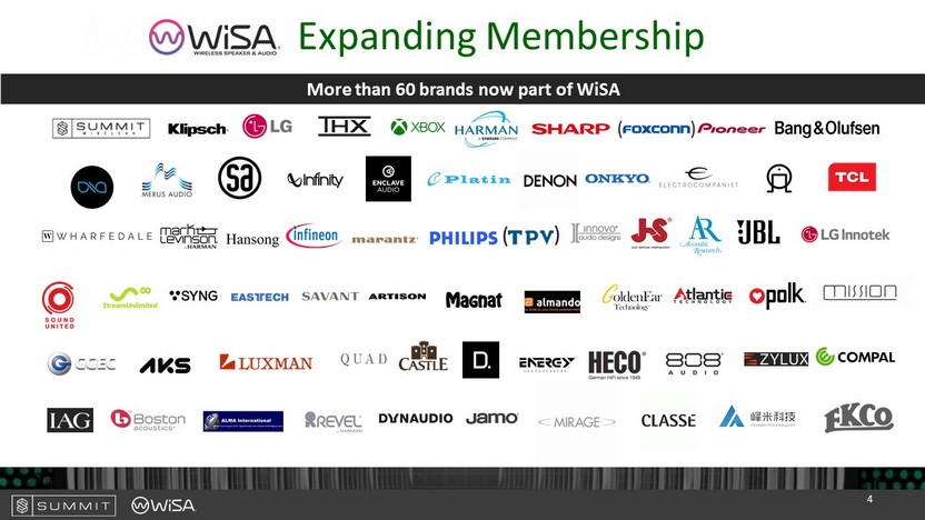 Q219 Update • WiSA YOY membership growth • TV brands from 2 to 7 • Total brands from 30+ to 60+ • But where’s the beef? • Products for 2019 Holiday Season • LG WiSA Launch • Addressable Market • Expected 2019 Milestones 3