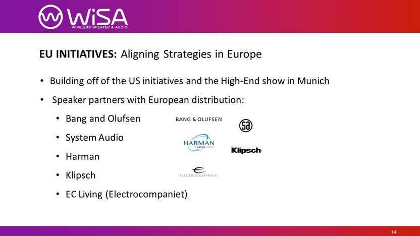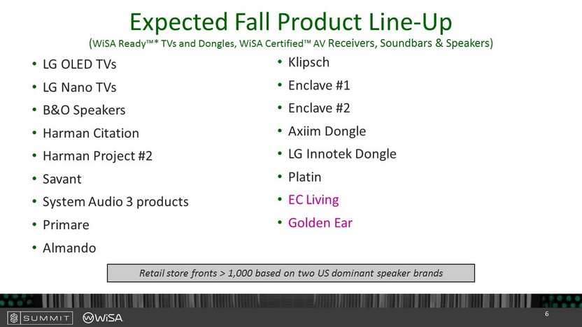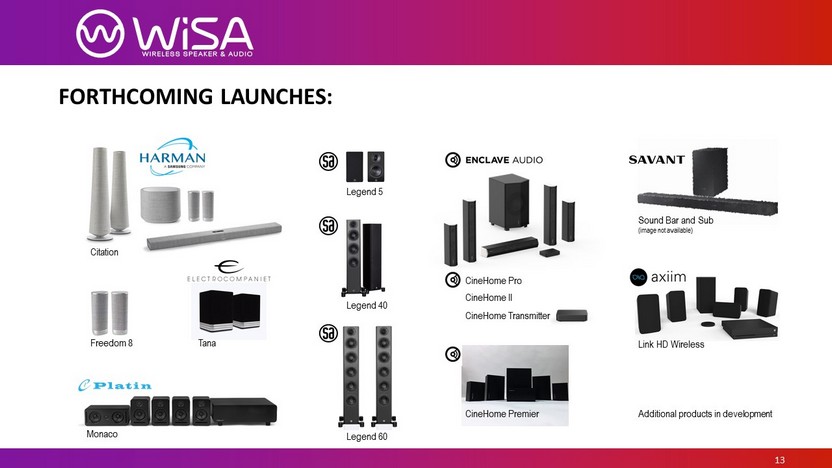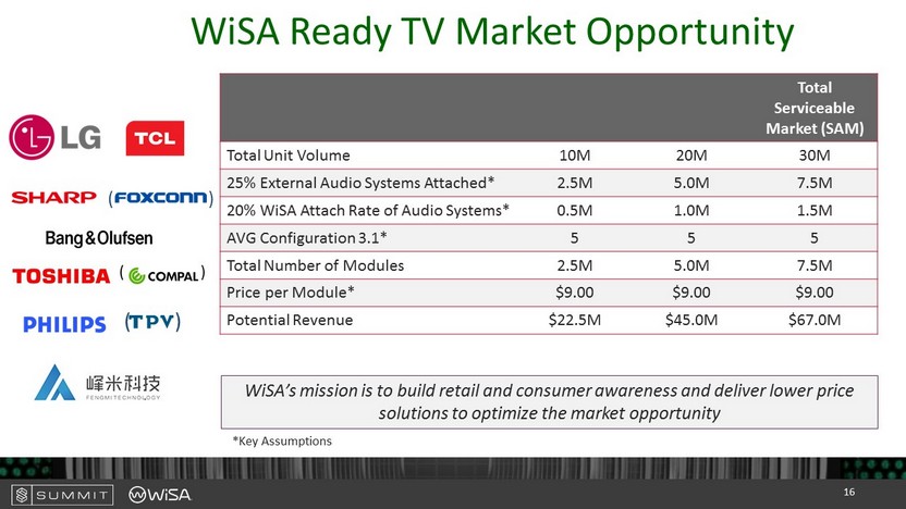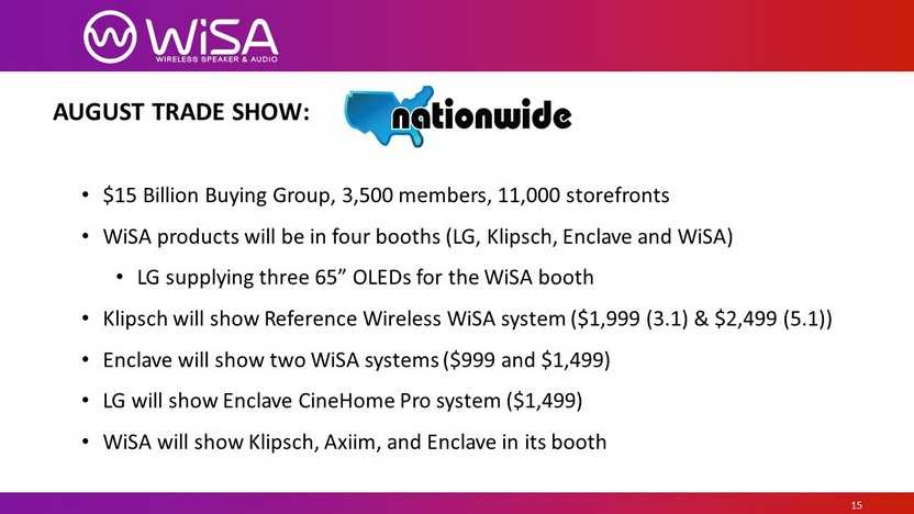 AUGUST TRADE SHOW: • $15 Billion Buying Group, 3,500 members, 11,000 storefronts • WiSA products will be in four booths (LG, Klipsch, Enclave and WiSA) • LG supplying three 65” OLEDs for the WiSA booth • Klipsch will show Reference Wireless WiSA system ($1,999 (3.1) & $2,499 (5.1)) • Enclave will show two WiSA systems ($999 and $1,499) • LG will show Enclave CineHome Pro system ($1,499) • WiSA will show Klipsch, Axiim , and Enclave in its booth 15