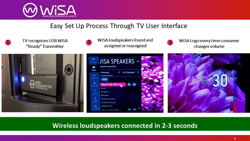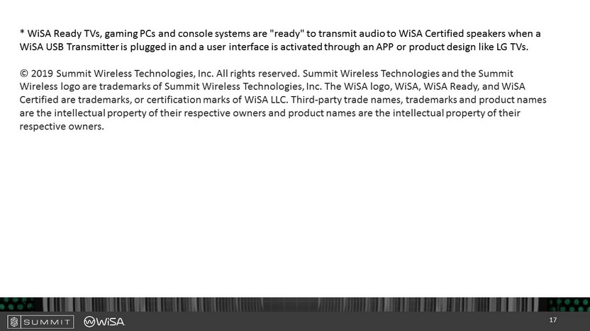 17 * WiSA Ready TVs, gaming PCs and console systems are "ready" to transmit audio to WiSA Certified speakers when a WiSA USB Transmitter is plugged in and a user interface is activated through an APP or product design like LG TVs. © 2019 Summit Wireless Technologies, Inc. All rights reserved. Summit Wireless Technologies and the Summit Wireless logo are trademarks of Summit Wireless Technologies, Inc. The WiSA logo, WiSA, WiSA Ready, and WiSA Certified are trademarks, or certification marks of WiSA LLC. Third - party trade names, trademarks and product names are the intellectual property of their respective owners and product names are the intellectual property of their respective owners.
